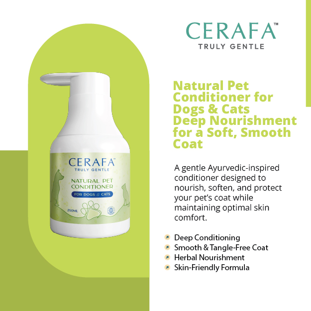 CERAFA Natural Pet Conditioner is made from a blend of natural, pet-safe herbal ingredients. It is specially designed to nourish, soften, and manage your pet’s coat with care. This conditioner is crafted to provide deep hydration and smoothness, helping to reduce dryness, tangles, and rough fur. It supports healthy skin and enhances natural coat shine, while forming a light protective layer against environmental stress, dust, and dryness.